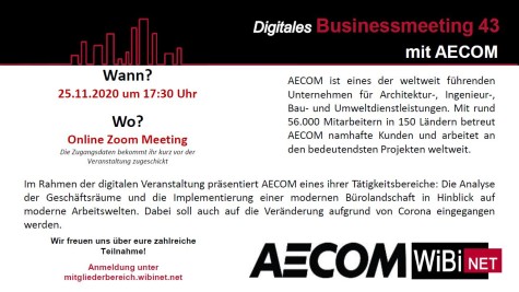 ![]()  ![]()  Digitales Businessmeeting 43 mit AECOM 28.11.2020 Am 25.11.2020 fand das erste digitale Business Meeting des WiBiNET e.v. statt. Zu Gast war das Unternehmen AECOM, eins der weltweit führenden Infrastrukturberatungsunternehmen, das professionelle Dienstleistungen während des gesamten Projektlebenszyklus anbietet
