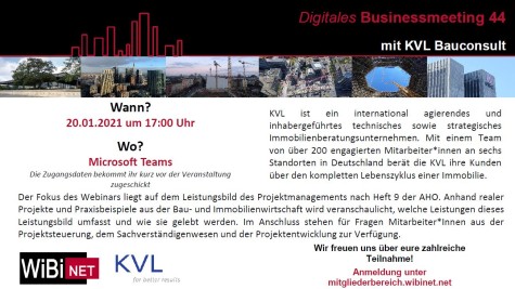 ![]()  ![]()  Digitales Businessmeeting 44 mit KVL Bauconsult 27.01.2021 Am 20.01.2021 veranstaltete der WiBiNET e.V. das letzte Businessmeeting des Wintersemesters 2020/21 zusammen mit KVL Bauconsult.