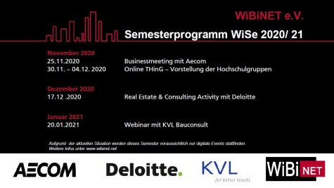![]()  ![]()  Semesterprogramm Wintersemester 2020/21 17.11.2020 Auch für das kommende Semester hat das WiBiNET wieder ein vielfältiges Angebot erarbeitet. Aufgrund der aktuellen Situation werden dieses Semester voraussichtlich nur digitale Events stattfinden, nichtsdestotrotz freuen wir uns auf spannende Veranstaltungen der etwas anderen Art. Neben dem Klassiker, einem Businessmeeting mit Aecom, stehen ein Online-THinG zur Vorstellung der Hochschulgruppen, ein neues Activity-Format mit Deloitte und ein Webinar mit KVL Bauconsult auf dem Programm.
