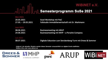 ![]()  ![]()  Semesterprogramm Sommersemester 2021 28.05.2021 Auch für das kommende Semester hat das WiBiNET wieder ein vielfältiges Angebot erarbeitet. Aufgrund der aktuellen Situation werden auch dieses Semester voraussichtlich nur digitale Events stattfinden, nichtsdestotrotz freuen wir uns auf spannende Veranstaltungen der etwas anderen Art. Neben zwei Businessmeeting mit ARUP und MHP, stehen ein Excel Workshop mit PwC, eine Fallstudie zur Immobilienwirtschaft mit Dr. Markmann sowie eine digitale Exkursion zum Senckenberg-Turm mit Drees & Sommer auf dem Programm.