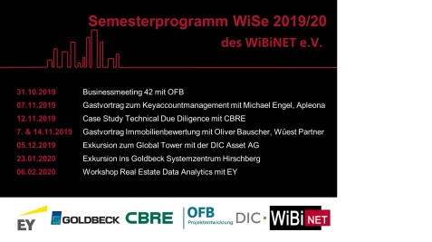 ![]()  ![]()  Semesterprogramm Wintersemester 2019/20 30.10.2019 Auch für das kommende Semester hat das WiBiNET wieder ein vielfältiges Angebot erarbeitet. Neben dem Klassiker, einem Business Meeting mit OFB, stehen eine Case Study mit CBRE, Exkursionen mit Goldbeck und DIC, ein Workshop mit EY Real Estate sowie verschieden Gastvorträge auf dem Programm.